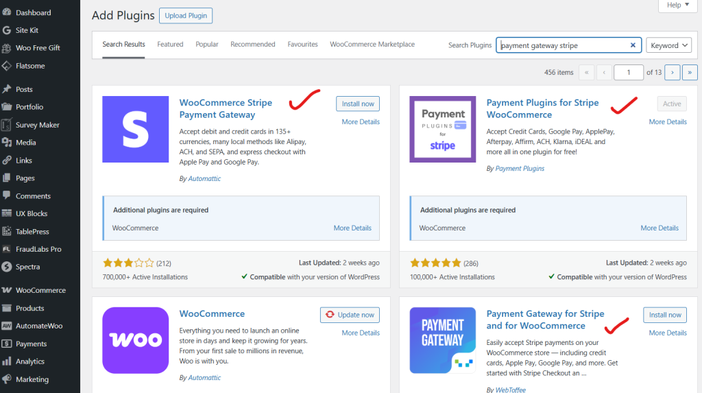 You will see popular plugins that will connect your WooCommerce to your Stripe. I recommend “Payment Plugins for Stripe WooCommerce” (the second one in the image below). Install and activate it.