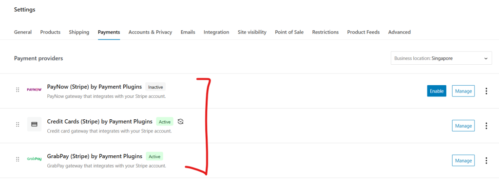 Enable the ones you want, such as credit card and GrabPay. But, don’t enable “PayNow (Stripe) by Payment Plugins” since that is the one that has commissions.
